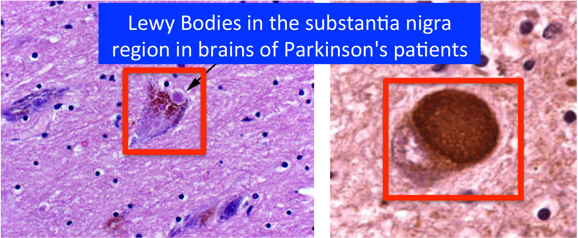 Shown below are two images of Lewy bodies; histological images done on brain tissue and viewed with a microscope. For further information on α-synuclein and Lewy bodies, please see: http://www.nia.nih.gov/alzheimers/publication/lewy-body-dementia/basics-lewy-body-dementia and http://www.nature.com/nature/journal/v388/n6645/full/388839a0.html and http://en.wikipedia.org/wiki/Lewy_body and https://www.michaeljfox.org/understanding-parkinsons/living-with-pd/topic.php?alpha-synuclein .
