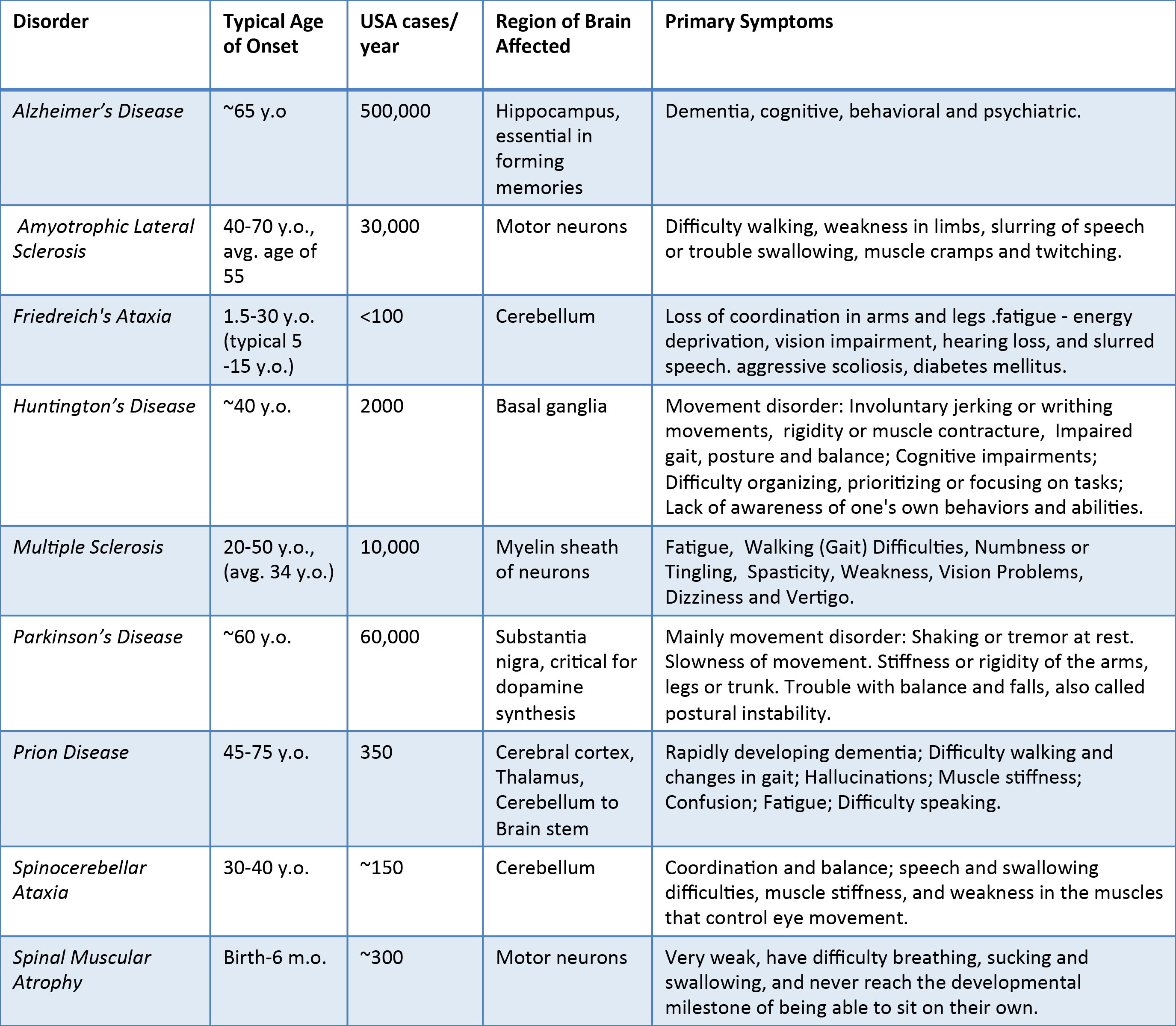 Comparison of these neurodegenerative disorders (see Table below): The table gives an overview of these neurodegenerative disorders with regard to age of onset, cases per year in the USA, area of brain altered, and the primary symptoms. This comparison highlights a number of differences, yet these diseases are unified by their neurodegenerative dysfunction. The many symptoms from each disorder illustrates the amazing importance of the brain and nervous system in the physiological functioning of the human body.