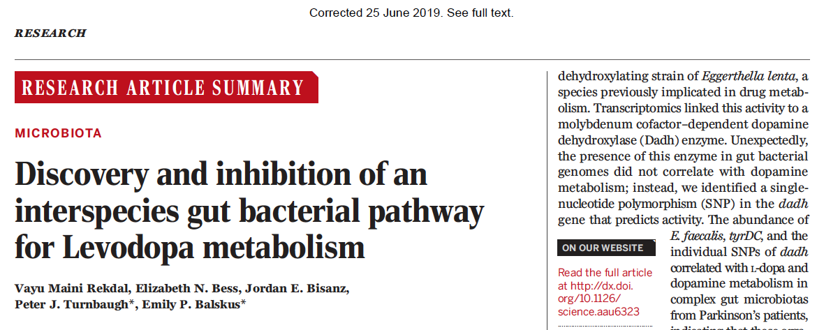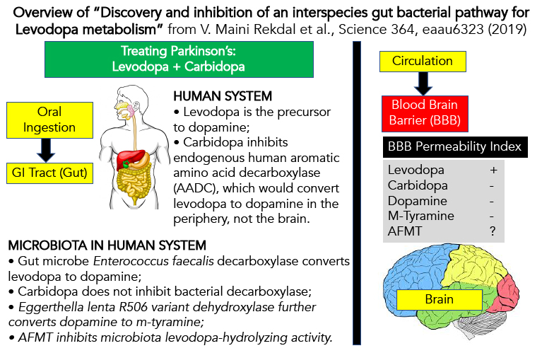 Overview: Reading the article entitled “Discovery and inhibition of an interspecies gut bacterial pathway for Levodopa metabolism” from V. Maini Rekdal et al., Science 364, eaau6323 (2019) (DOI: 10.1126/science.aau6323- open access) made me realize why I became a scientist and did the whole graduate school (M.S. and Ph.D.) and postdoctoral fellowship routine; and why I have spent the past 37 years career-wise in biomedical research and education at a medical school.