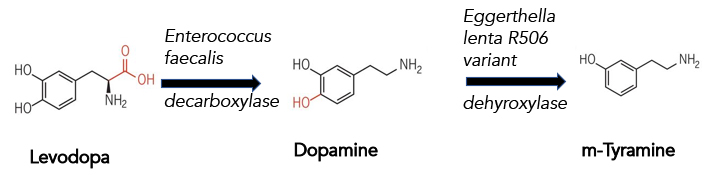 • They then turned to culturing studies and identified a bacterial strain named Eggerthella lenta that had the ability to dehydroxylate dopamine to m-tyramine. To further enrich their story, this dehyroxylate activity was only present in samples of single-nucleotide polymorphisms, or SNPs (a variant of Arg-506)