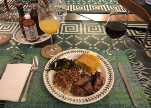 A Southern Good Luck Meal in the New Year: Maybe your family has a New Year’s Day tradition? In the southern states of the U.S., there are many traditions we follow, but one of my favorites is the New Year’s Day meal. And having this meal on New Year’s Day should give you a good, healthy, prosperous and lucky new year. The meal typically consists of black-eyed peas, collard greens, cornbread, and pork roast (with or without smoked hog jowls), see picture below. Yes, it is a very southern meal!