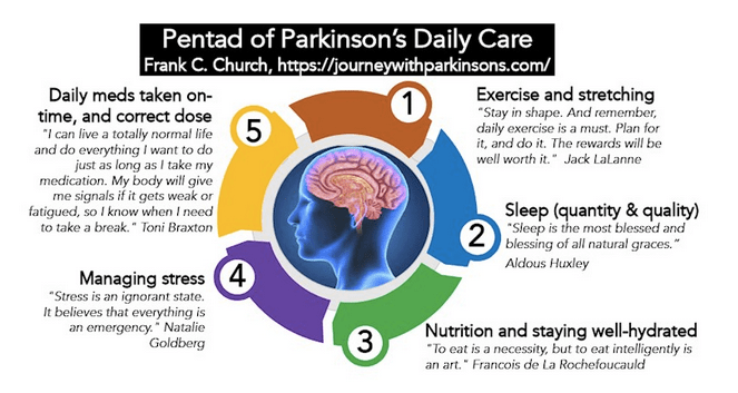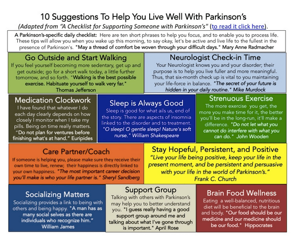 Start the New Year With a Plan: I have never been someone who has a list of new year’s resolutions or even a bucket-list of things to do; I may have an internal working list buried in my mind, but none of it is written down. By contrast, I like making 1-page handouts. I call them ‘CliffsNotes’ of Frank’s blog posts (maybe you don’t remember CliffsNotes?). To begin 2020, I close with four 1-page summaries of past blog posts. The goal is to help, and hopefully, enable you to shoot out of the starting gate of 2020, way ahead of that slowly evolving menace named Parkinson’s. Happy New Year!
