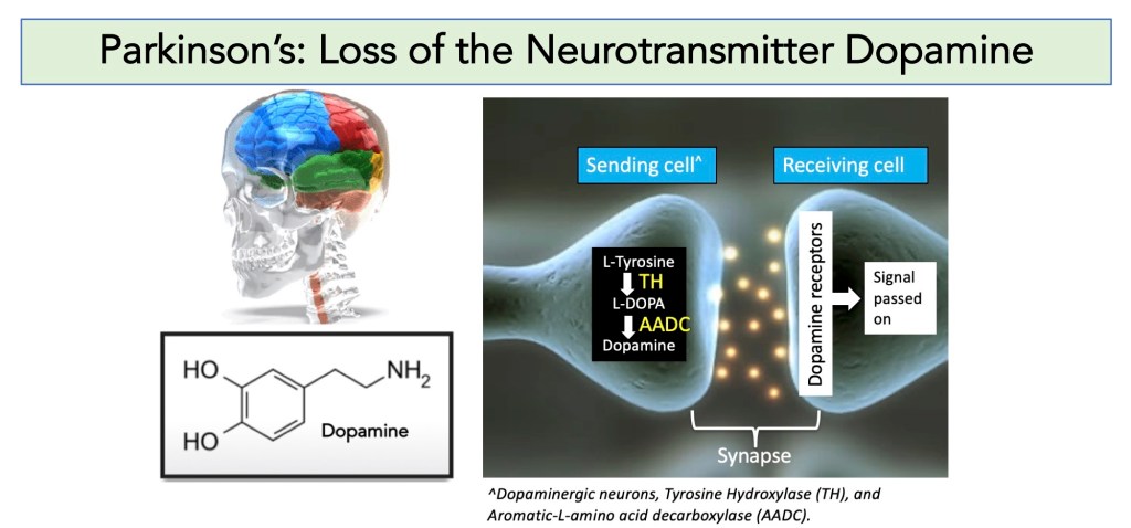 - The top panel of the figure below just reminds one of the structure of dopamine and the neurotransmitter function of neurons sending and receiving dopamine.