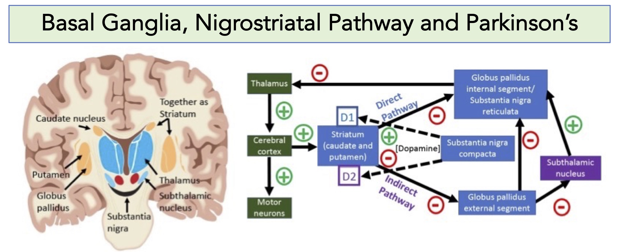 - The middle panel of the figure below reviews the motor function of dopamine through the nigrostriatal pathway.
