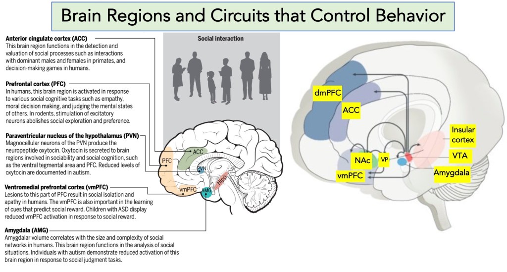 - The bottom panel of the figure is derived from two papers that are described in the legend below. The left side of the bottom panel highlights the regions of the brain that control social behavior and emotion, while the right side of the bottom panel highlights the circuits that wire these regions of the brain together, this includes the mesocortical and the mesolimbic pathways of dopamine. [You can enlarge the top, middle, and bottom portions of these images by clicking on them.]