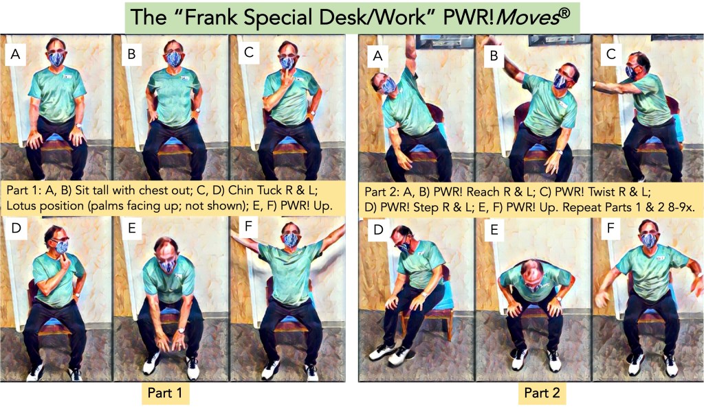- “Frank’s Special Desk/Work PWR!Moves Exercise Routine” (good for stretching neck and back- See image below). [Note: this exercise was part of my treatment plan devised by Dr. Rebecca R. Bliss, Fyzical Therapy and Balance Centers, Durham, NC.]
