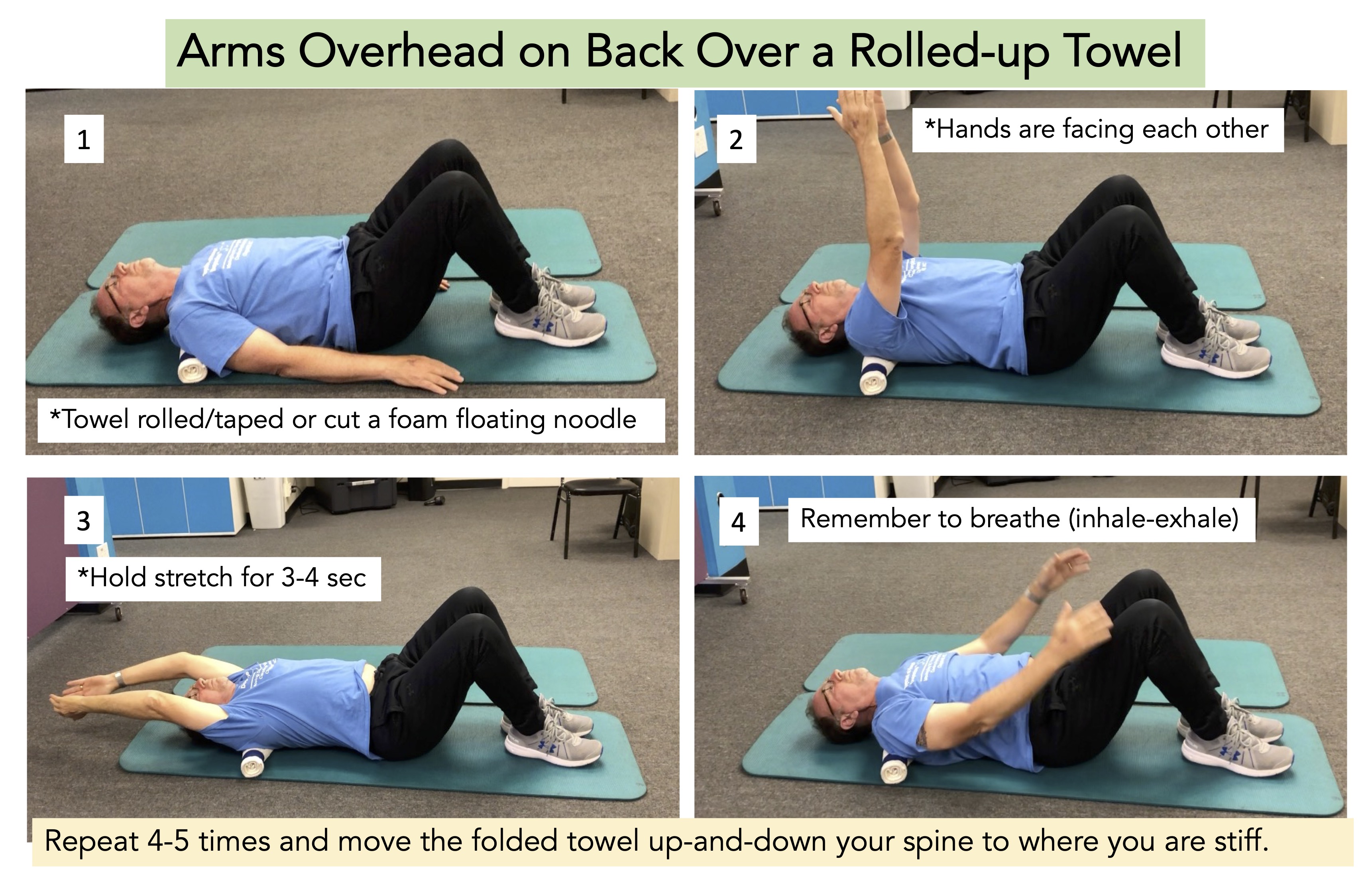 - Sore-stiff back, perform the following exercise “Arms Overhead on Back Over a Rolled-up Towel.” This works well using either a rolled-up towel or cut a hollow foam pool doodle (See image below). [Note: this exercise was part of my treatment plan devised by Dr. Jennifer K. Bazan-Wigle at the PWR!Gym, Parkinson Wellness Recovery, Tucson, AZ.]