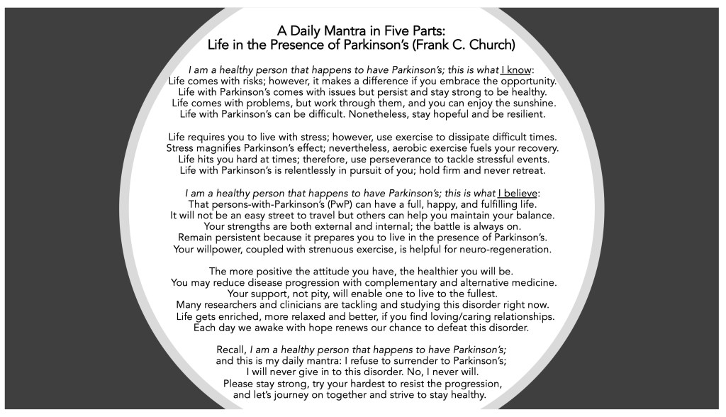 Thank you as always Frank. Love your mantra in five parts. I resonate with the statement “I am a healthy person that happens to have Parkinson’s.” So true – for me anyway. Congratulations on your retirement. Best,