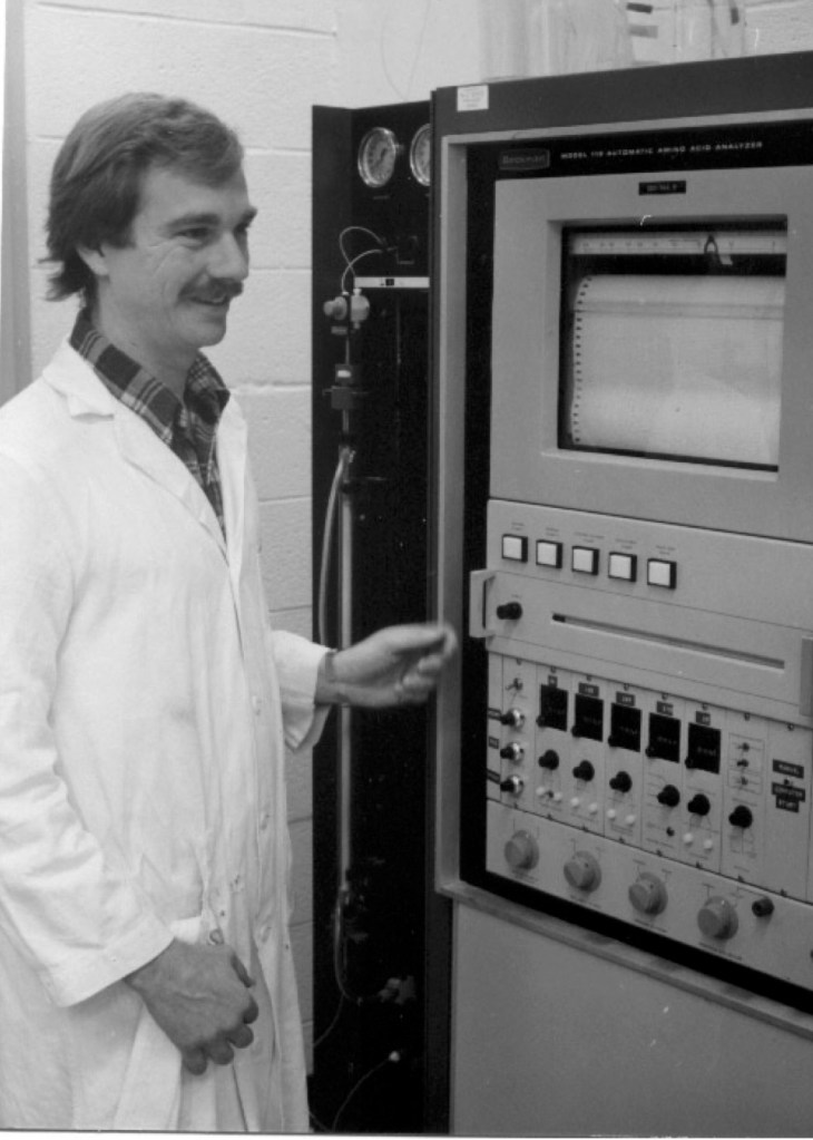 Jump forward to North Carolina State University graduate school and the beginning of my PhD work in the late 1970s. One of my first tasks was assisting a senior graduate student in rejuvenating an amino acid analyzer (critical for assessing and quantitating many things related to proteins). It was a struggle, but George was a good teacher, and I survived mainly by posing for the picture when the job was finished. And we had a working amino acid analyzer back online in the laboratory.