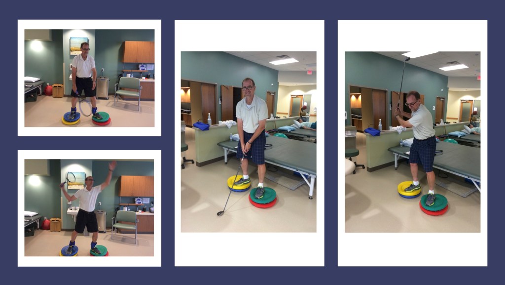 Several years ago, using my 2 favorite sports golf and tennis, my two PT’s presented me with these unequal balance devices and asked me to swing my clubs. The goal was to stay balanced while performing the movement. I did slip several times with the PT’s there to stabilize my balance. I would only recommend you do this sort of exercise under strict supervision and guidance by trained and certified professionals.