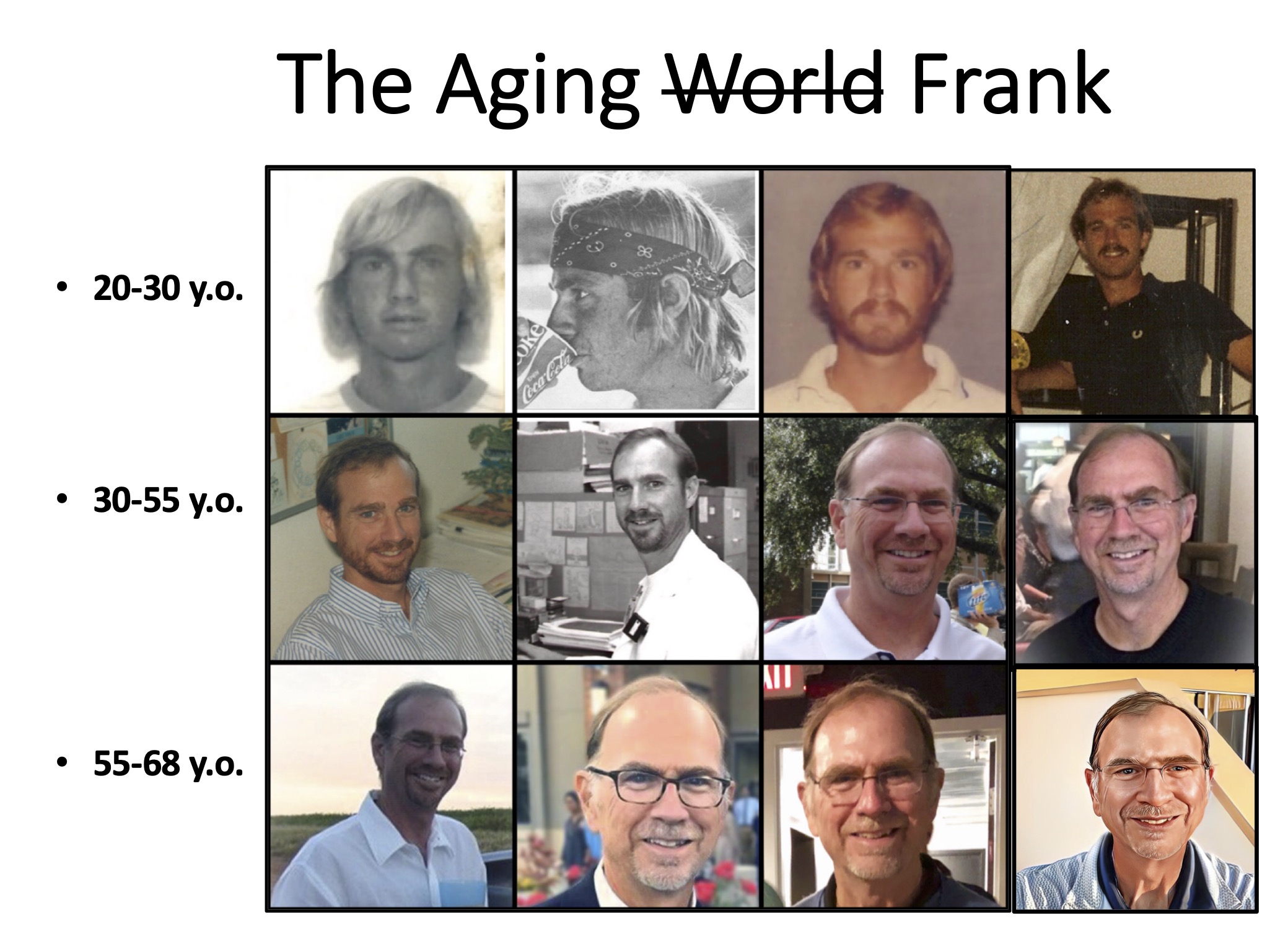 Included below are some images regarding the biology of aging. It is not meant to be an exhaustive review, just a few points of interest. As we age, things will wear down and work less well than earlier in life. It is an inevitable process because we have lived through a lot, and the response of our host defense mechanisms (immune and inflammatory) has been challenged throughout our lives. Also included is a picture gram of me from about 20 years old to the current time.