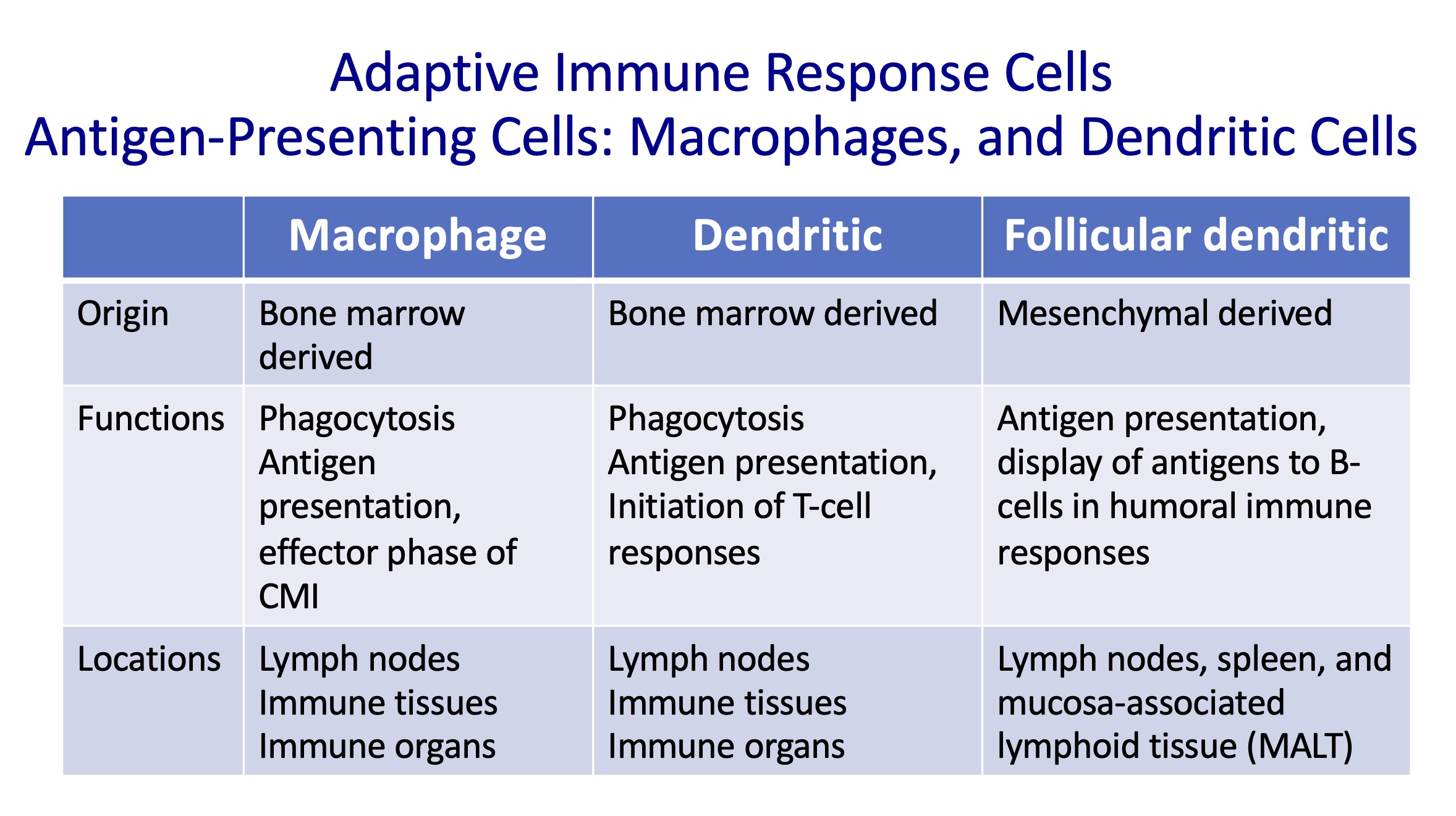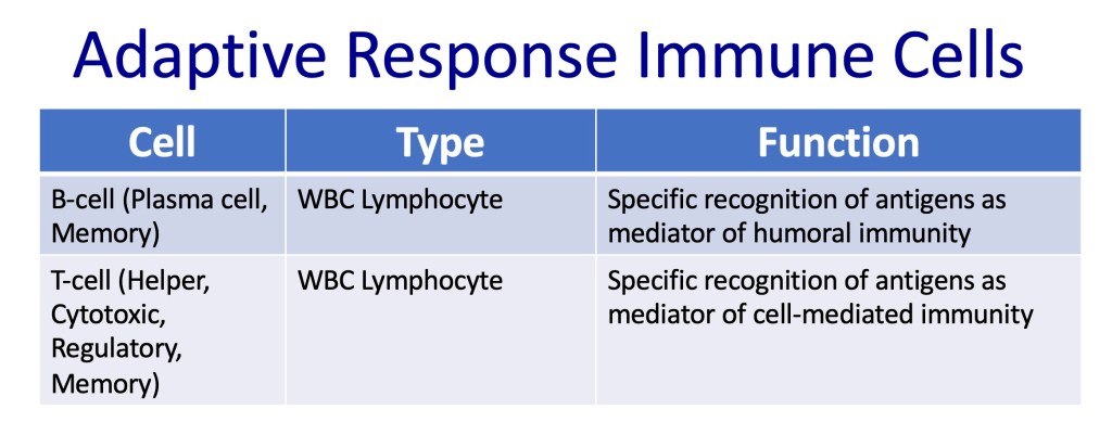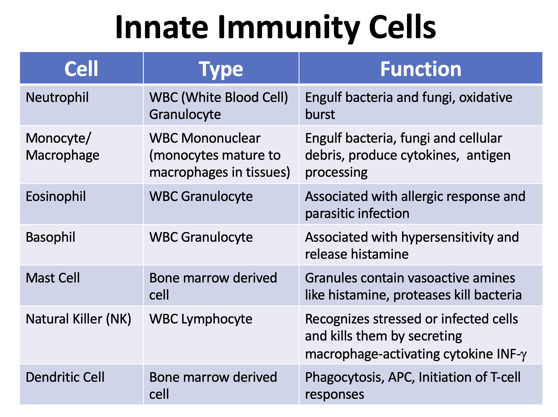 The details of the cells involved in innate and adaptive immune systems are in table format below.