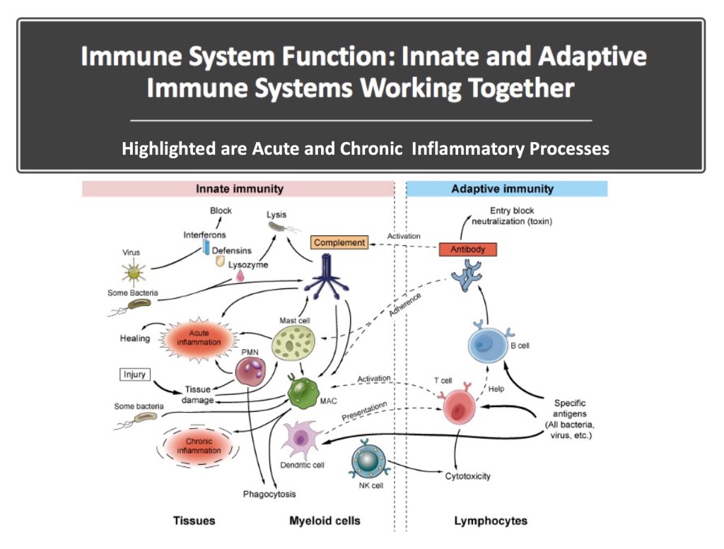 Combining Innate and Adaptive Immune Systems is Powerful: In previous work on the immune system, exercise, and Parkinson’s, we said, “The immune system protects the body against infection and non-native substances through intricate pathways that ultimately distinguish everything foreign from non-foreign within a given person.” The schematic below does an excellent job of visualizing the interplay of innate and adaptive immunity, and it illustrates the links between inflammation and the immune system given by acute inflammation and chronic inflammation ( image credit: Creative-diagnostics.com)