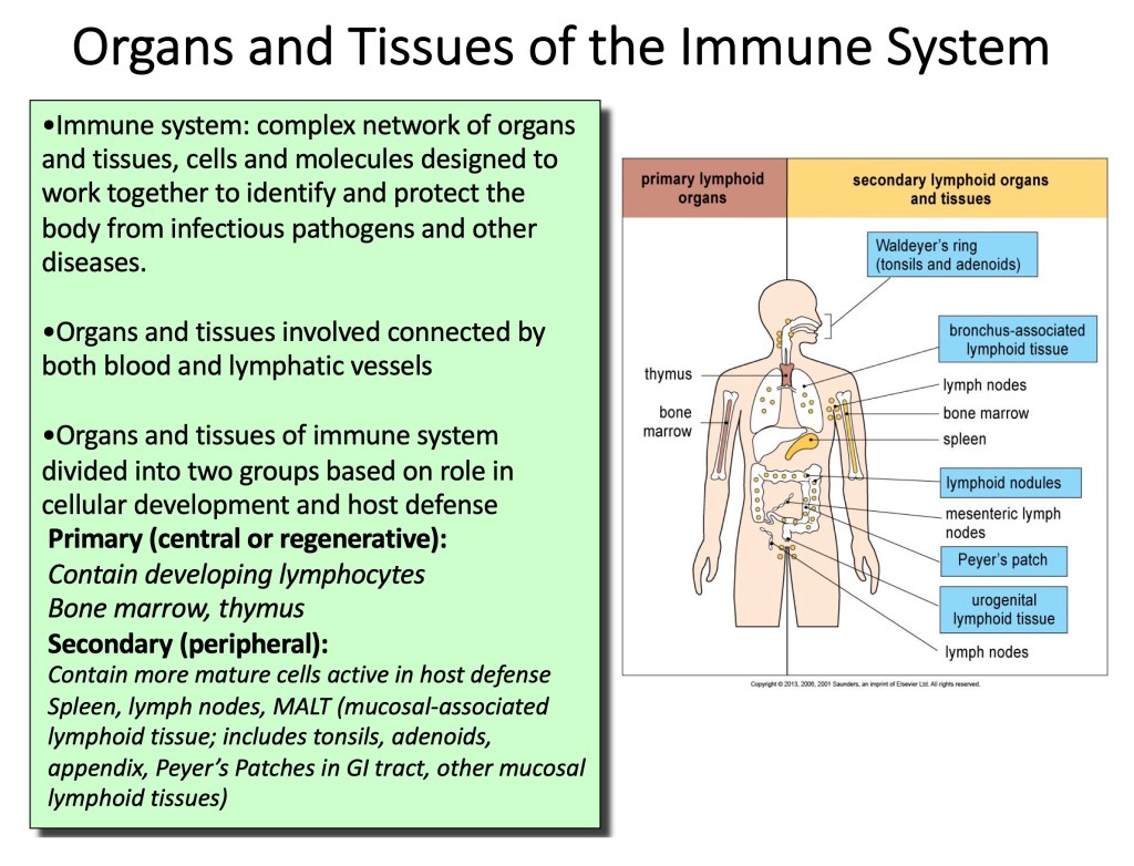 •Organs and tissues connected by both blood and lymphatic vessels Organs and tissues of immune system divided into two groups based on role in cellular development and host defense.