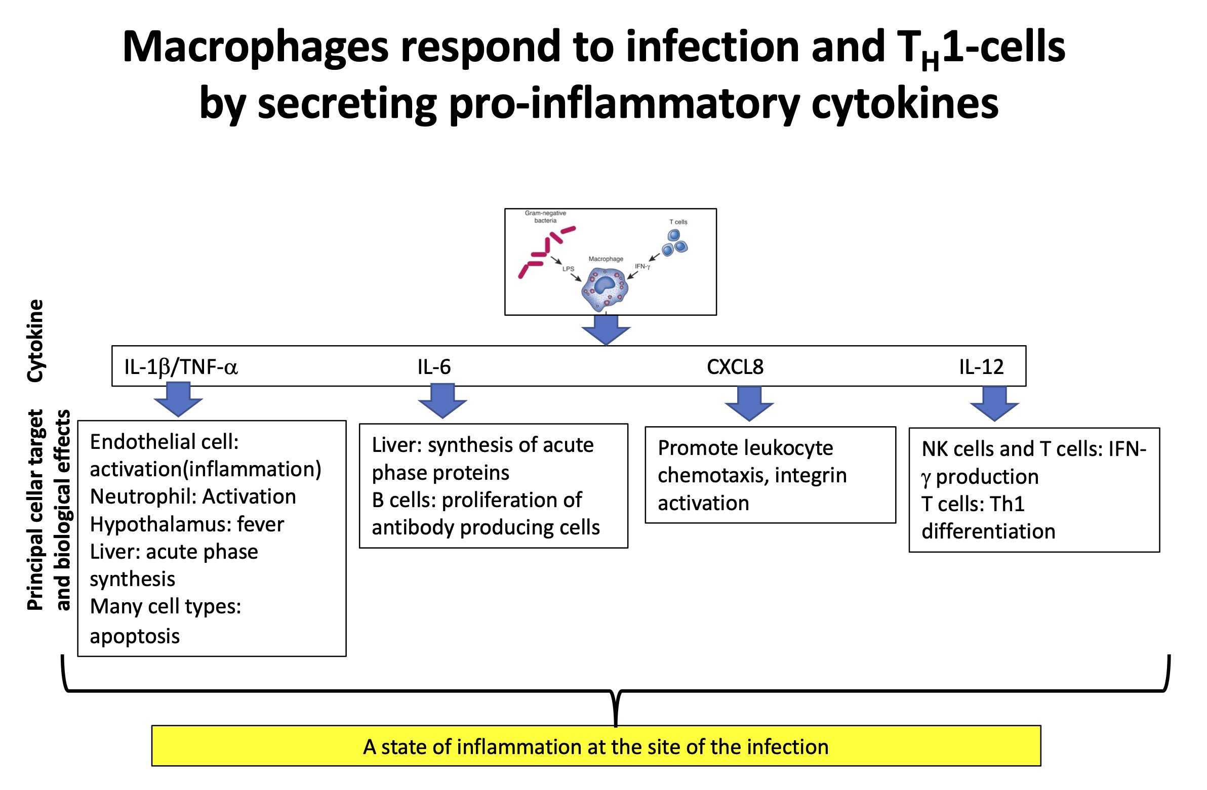 •Macrophages produce cytokines, which alert/recruit other immune system cells, and thus, the inflammatory response (battle) is on;