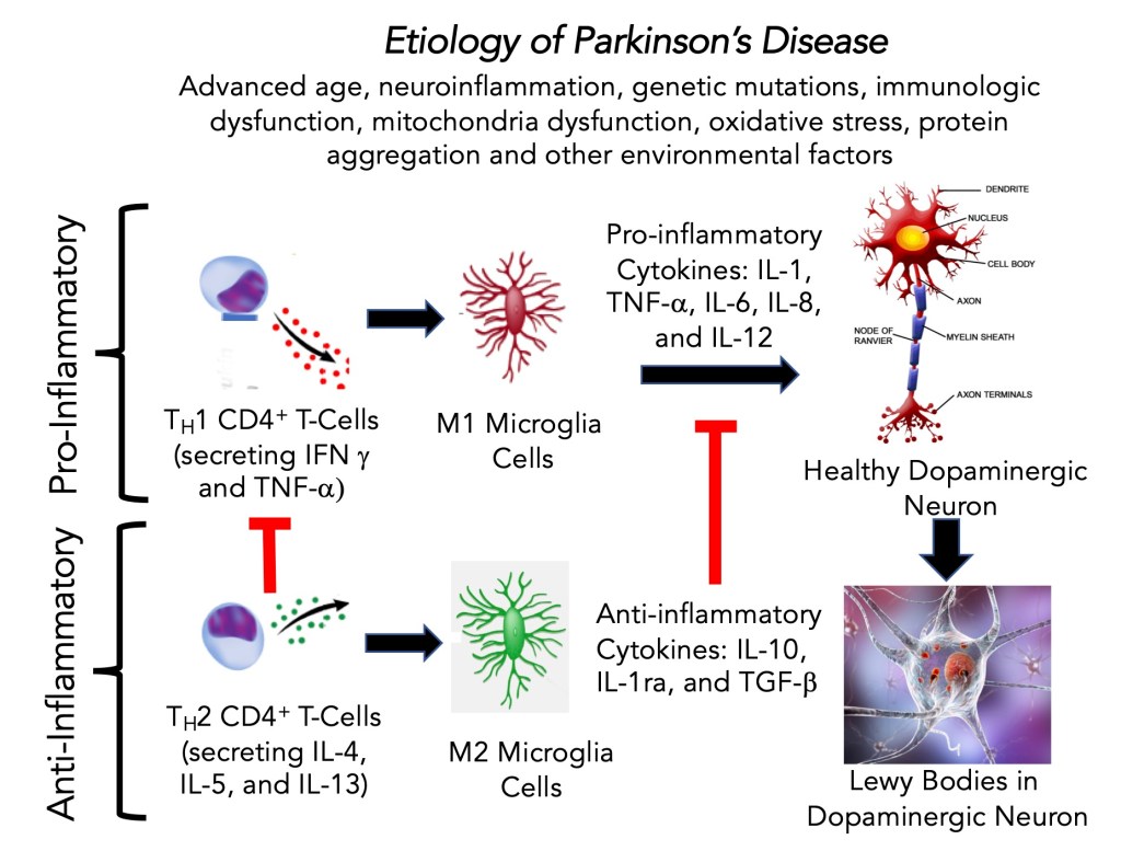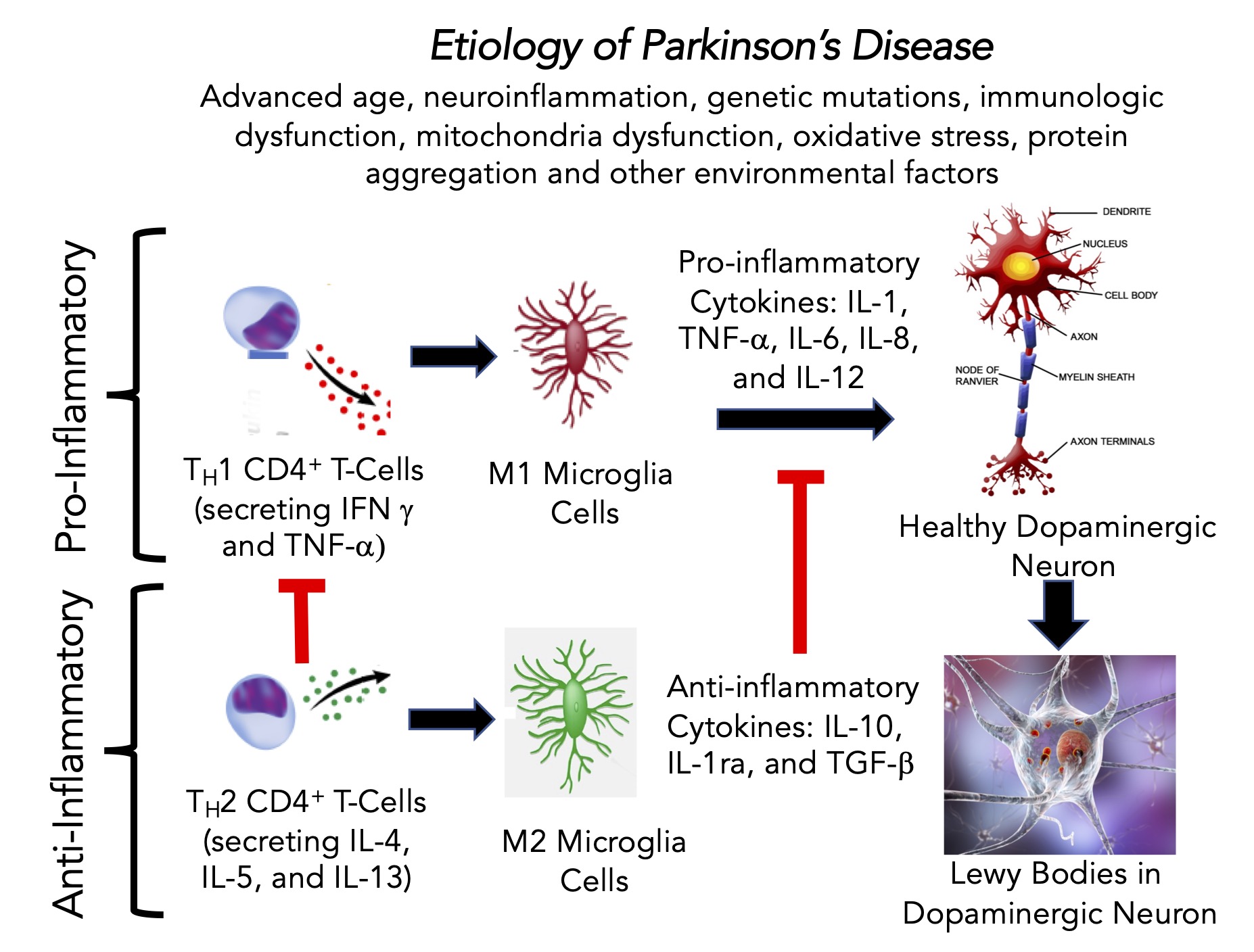 •There is an imbalance in Parkinson’s to favor the pro-inflammatory CD4+ T cells, resulting in a sustained neuroinflammatory state.
