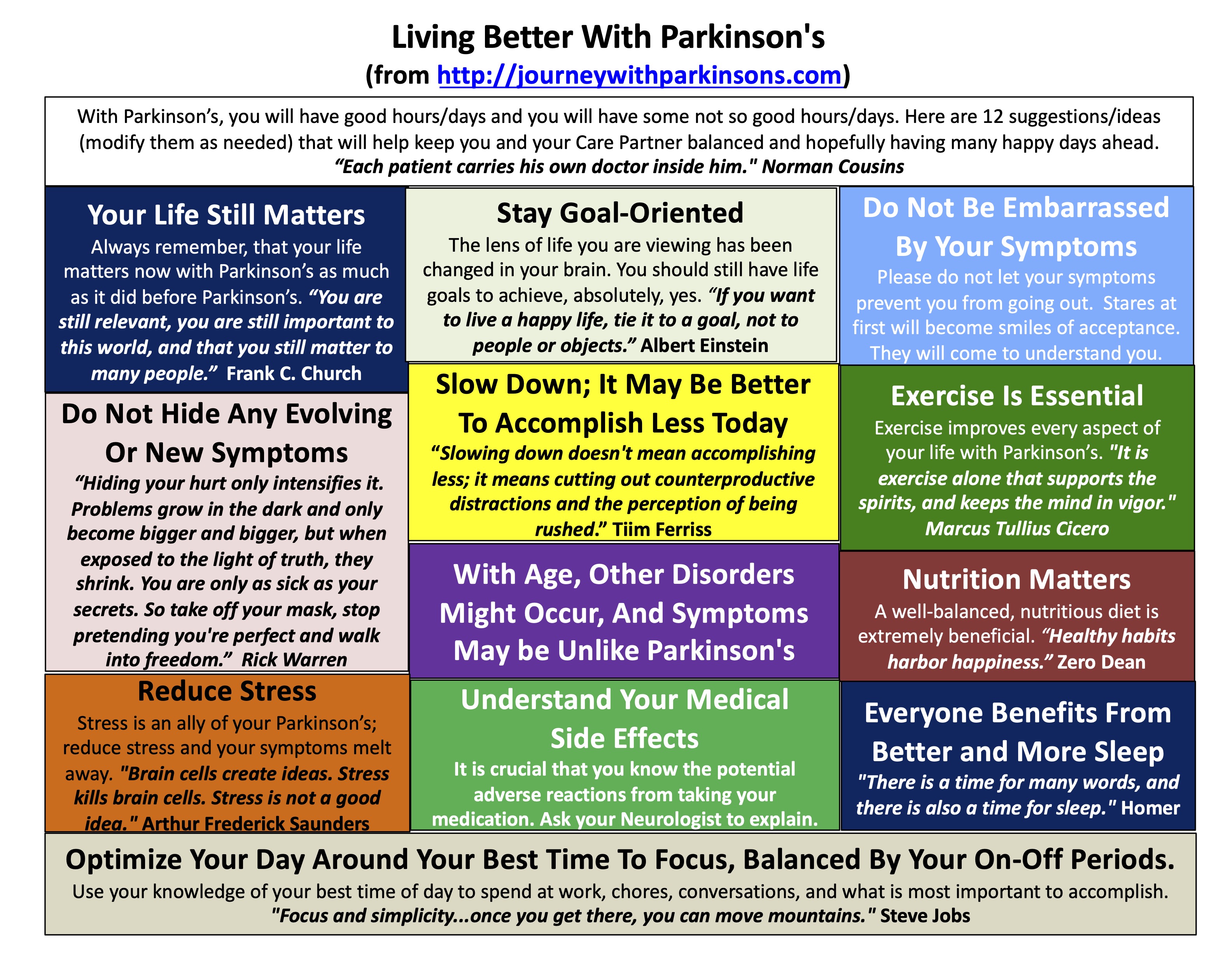 TwelveSuggestions/Ideas for Living Well With Parkinson’s: These are not Rules, and they may not all apply to every PwP or Care Partner. And you may want to adapt/modify/change any of these suggestions to fit better your role in living with Parkinson’s and the one handling the burden of your life with Parkinson’s. Furthermore, remember I am a biochemist, not a “life coach” or psychologist; thus, these are points to be considered by you and your Care Partner/Team/Family.