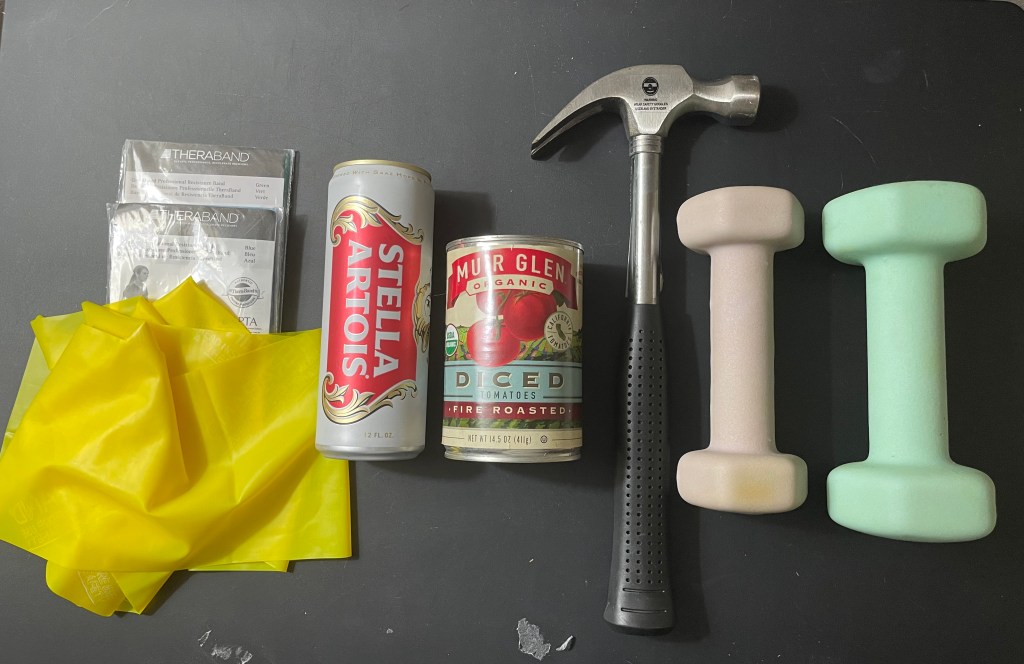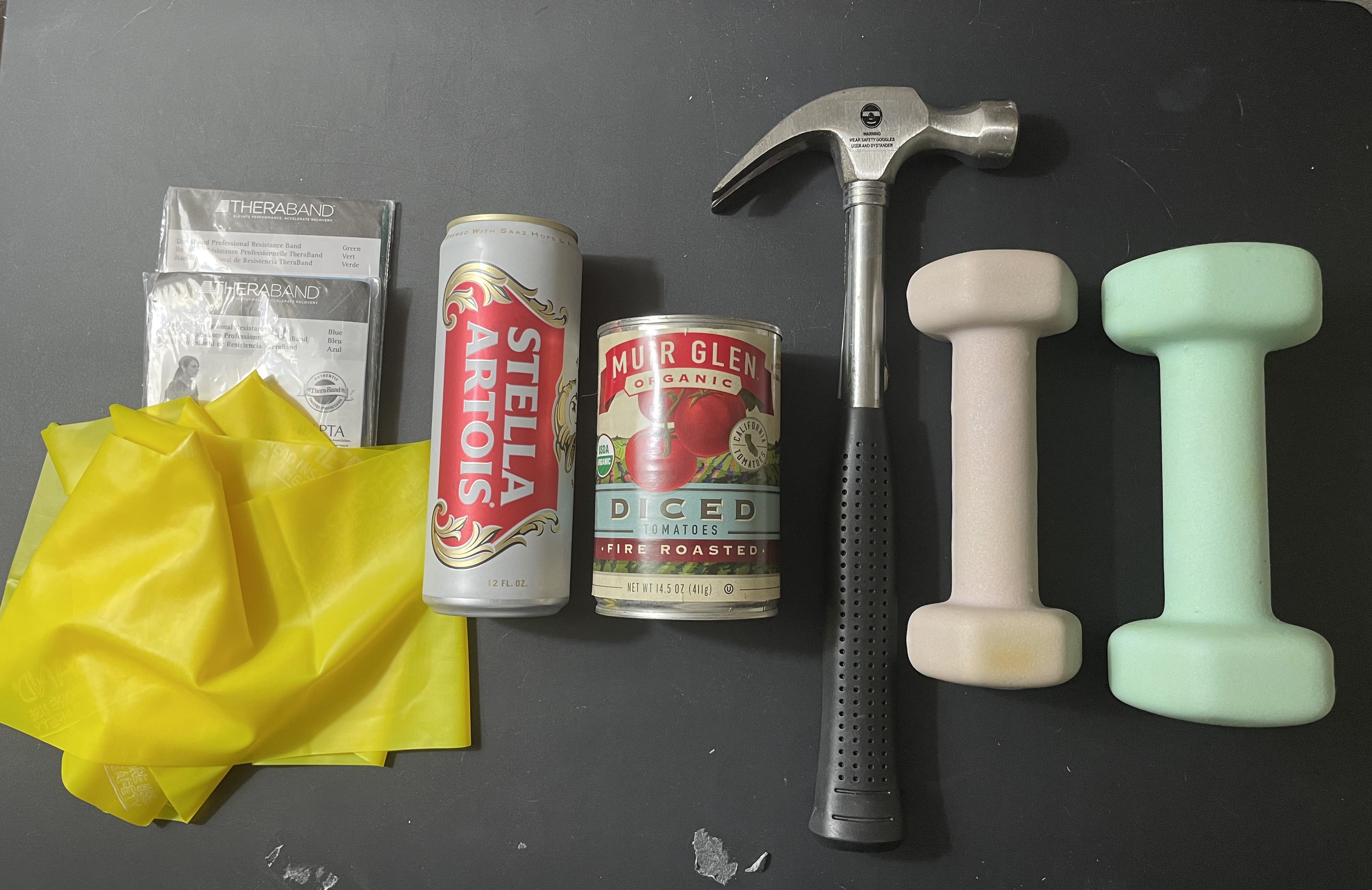 TheraBands are resistant exercise bands that are helpful (far left side). They come in different resistance levels (I have yellow, green, and blue TheraBands; http://www.TheraBand.com; I purchased mine from my PT); 2 cans of different weights; hammer; and 2 dumbbells (these are 3 and 5 lbs, respectively).
