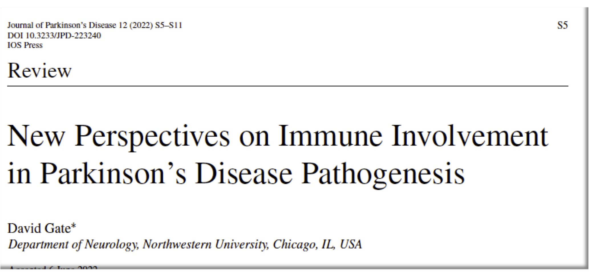 Gate, David. “New perspectives on immune involvement in Parkinson’s disease pathogenesis.” Journal of Parkinson’s disease Preprint (2022): 1-7.