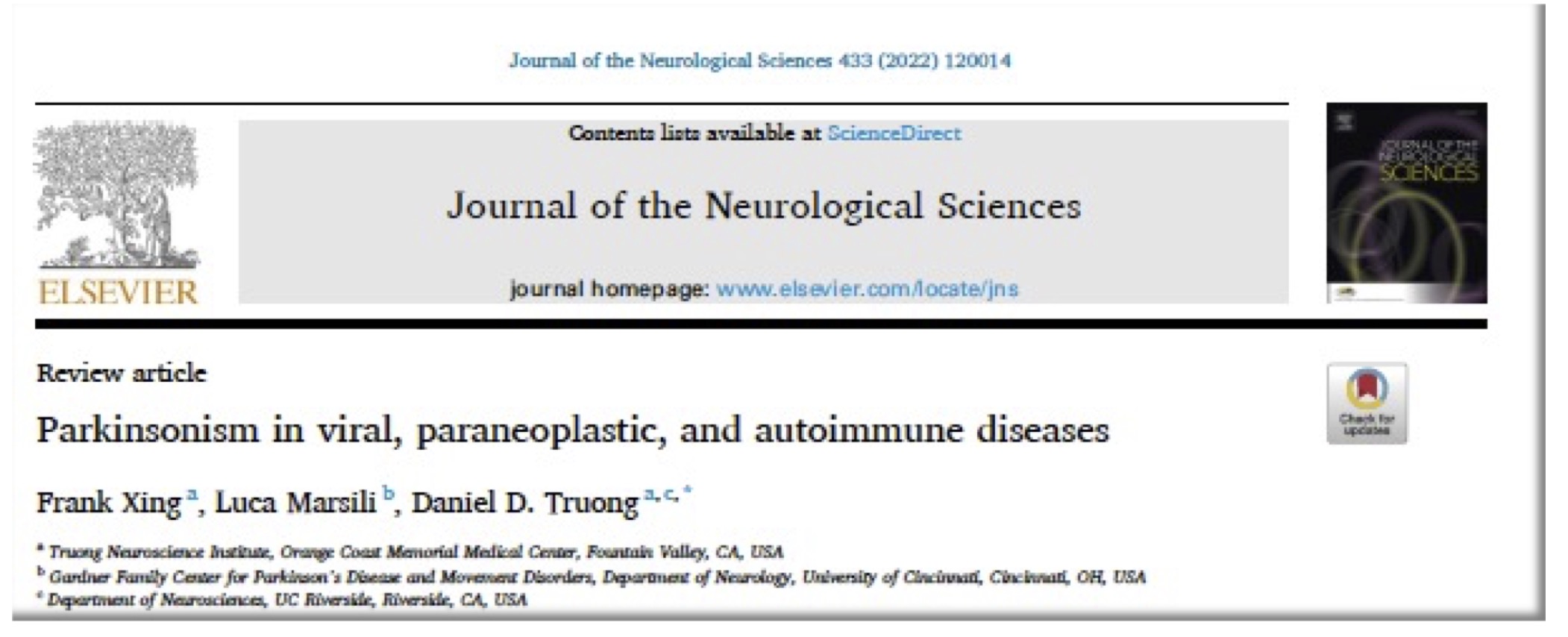 Xing, Frank, Luca Marsili, and Daniel D. Truong. “Parkinsonism in viral, paraneoplastic, and autoimmune diseases.” Journal of the Neurological Sciences 433 (2022): 120014.