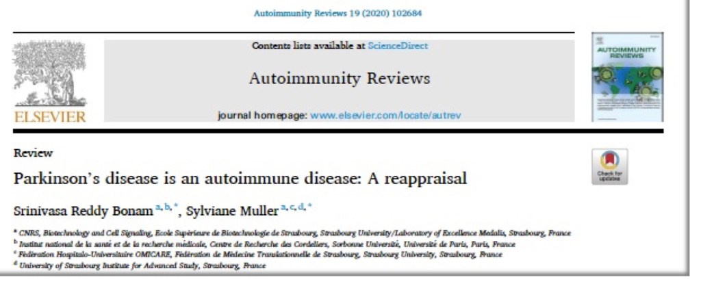 Bonam, Srinivasa Reddy, and Sylviane Muller. “Parkinson’s disease is an autoimmune disease: A reappraisal.” Autoimmunity Reviews 19, no. 12 (2020): 102684.