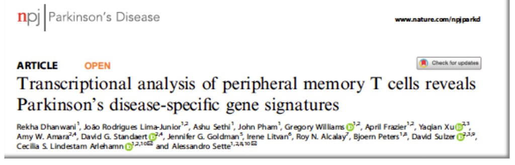 Dhanwani, Rekha, JoĂ£o Rodrigues Lima-Junior, Ashu Sethi, John Pham, Gregory Williams, April Frazier, Yaqian Xu et al. “Transcriptional analysis of peripheral memory T cells reveals Parkinson’s disease-specific gene signatures.” npj Parkinson’s Disease 8, no. 1 (2022): 1-10.