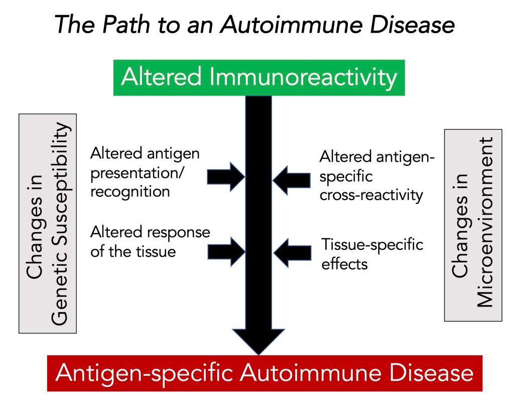 •First, an individual must express MHC molecules that efficiently present a peptide derived from the target self-antigen. [The major histocompatibility complex (MHC) of genes consists of a linked set of genetic loci encoding many of the proteins involved in antigen presentation to T cells, most notably the MHC class I and class II glycoproteins.] In other words, the MHC molecules you inherit play a role in determining your susceptibility to an autoimmune disease. For example, only ~0.2% of the U.S. population suffers from juvenile diabetes; however, they inherit two particular types of class II MHC, and the probability of contracting juvenile diabetes increases ~20-fold.