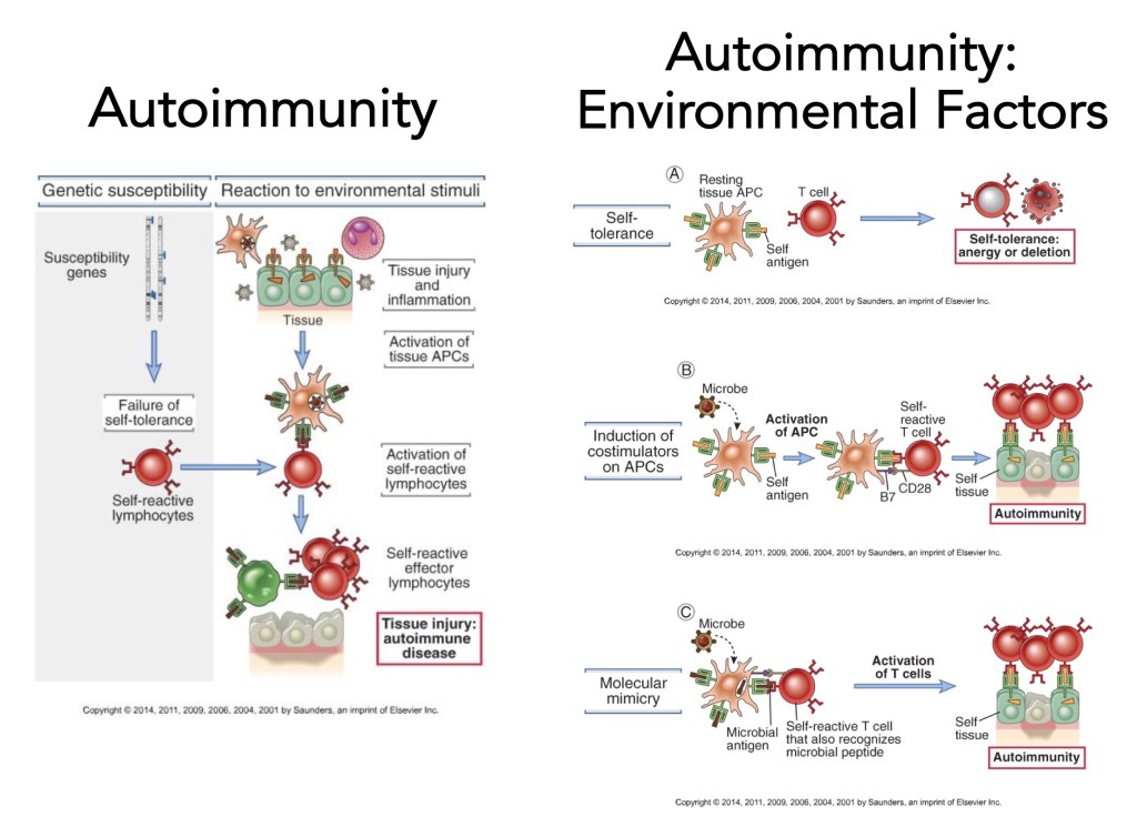 •Third, environmental factors must lead to the breakdown of the tolerance mechanisms, which have been designed to eliminate self-reactive lymphocytes. The current favorite hypothesis is that microbial attack (bacterial or viral) triggers the event as a ‘last straw’ that leads to autoimmune disease- we call it “molecular mimicry.” The schematic below illustrates some of these ‘issues.’