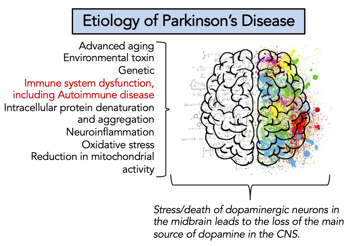Linking Autoimmunity to Parkinson’s: Neuroinflammation is related to the etiology of Parkinson’s. Now we link autoimmunity. It began with the epidemiological linkage of common genetic loci between Parkinson’s and autoimmune diseases. They have found that patients with multiple sclerosis, Graves’ disease, Hashimoto disease, and pernicious anemia have an increased risk of developing Parkinson’s. Recently, Genome-wide association studies (GWAS) found seventeen shared loci between autoimmune diseases and Parkinson’s; this includes type 1 diabetes, Crohn’s disease, ulcerative colitis, coeliac disease, psoriasis, rheumatoid arthritis, and multiple sclerosis.