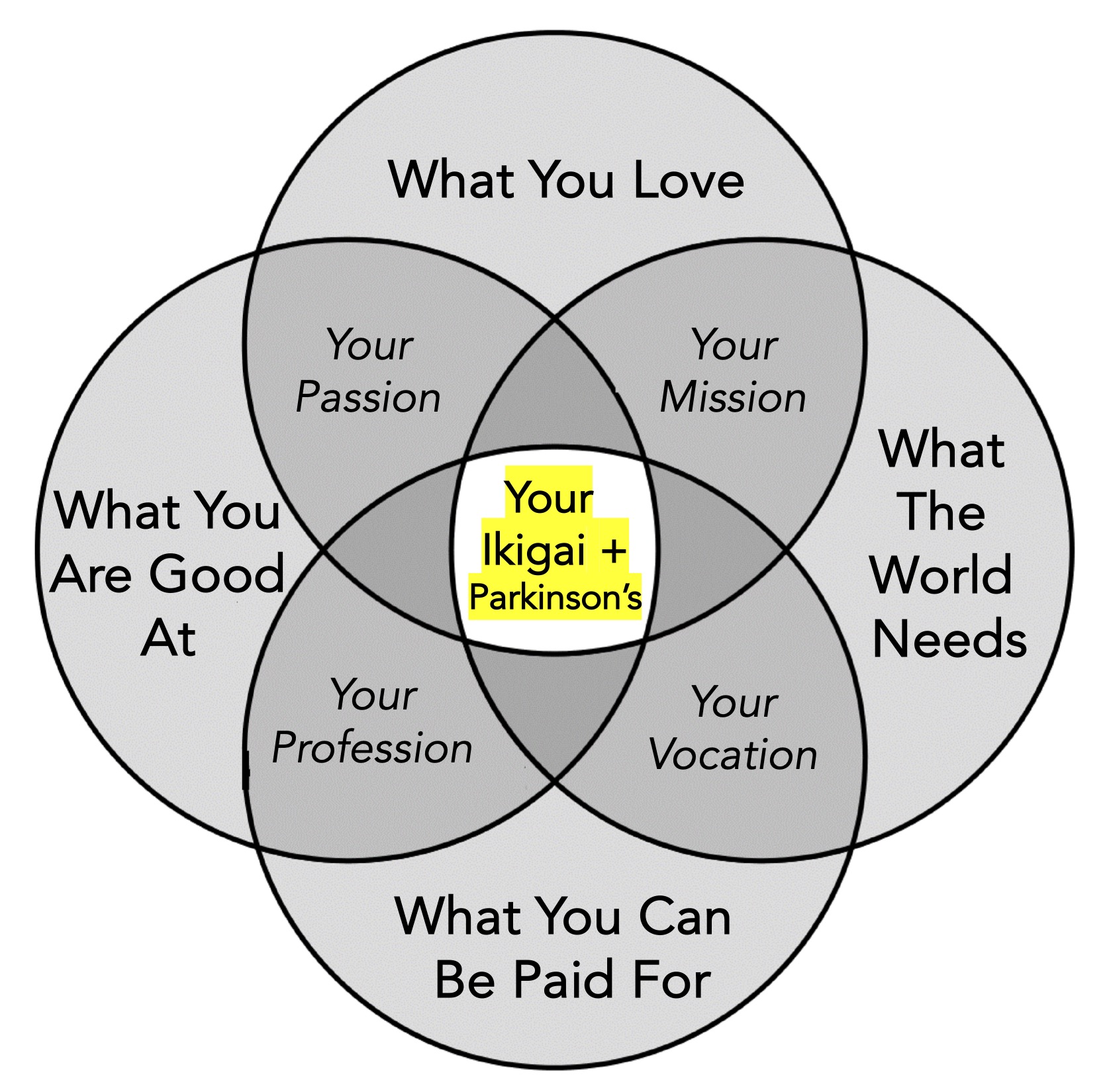 A Plan for Life With Parkinson’s:Ā One goal for doing this exercise is to better understand your current and future life in the presence of Parkinson’s. Finding your ikigai reminds you that you still have much energy to burn and life left to live, even amid this disorder. You still have talents, you still have passions, and you still have motivations, and together, they add up to your purpose in life. By finding your ikigai, you possibly complete the missing pieces of the puzzle. And if you are retired and with Parkinson’s, finding your ikigai may provide you the path to follow and a clearer perspective.