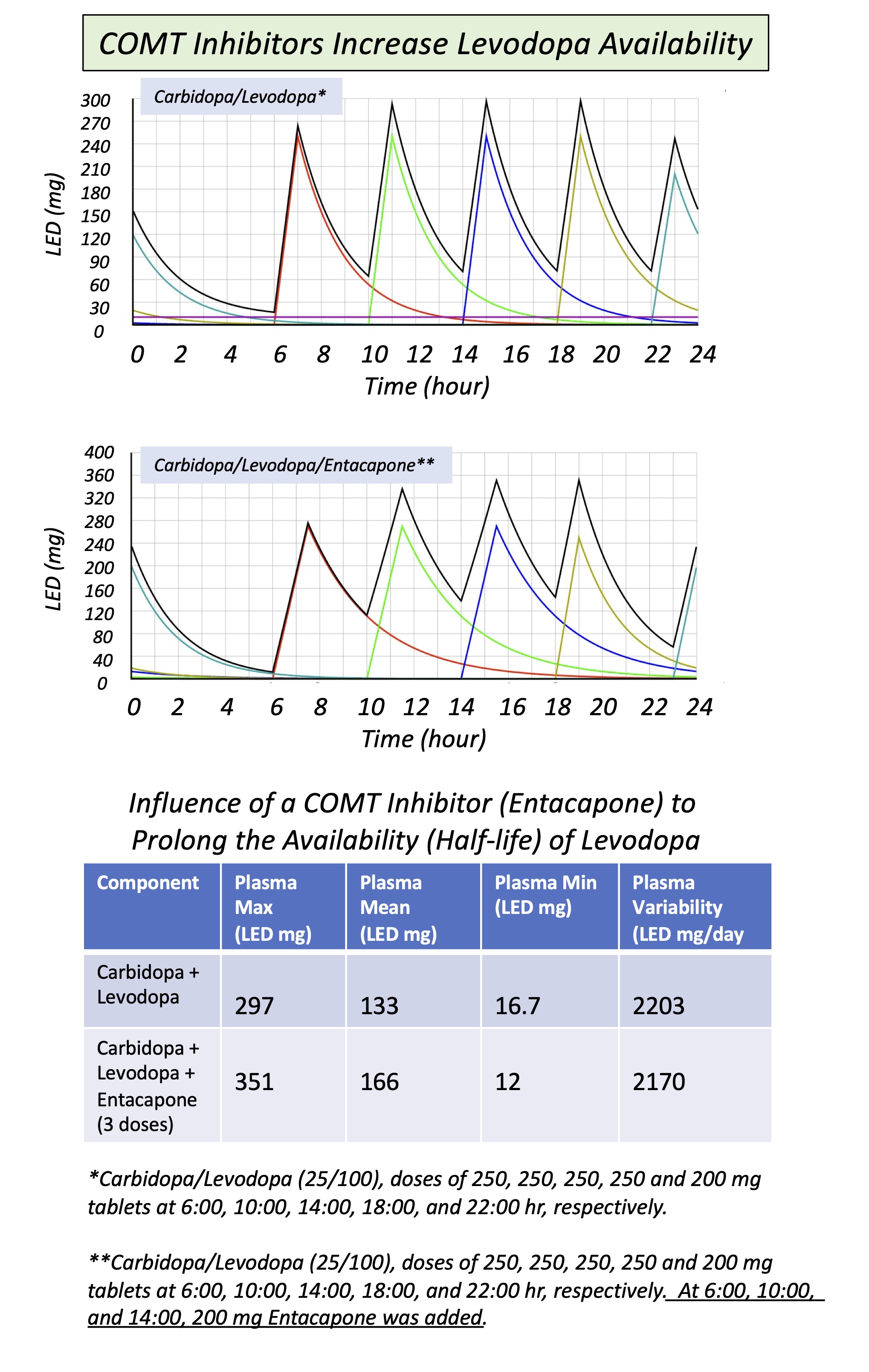The Table above nicely summarizes what Entacapone is doing. In a day, I take five doses of Carbidopa/Levodopa (shown in the top graph and Table). The peaks with each amount go up nicely and down again, which shows how an ‘off-on’ period begins. Now look at the second graph with added Entacapone with Carbidopa/Levodopa. The doses are both broader and higher, showing that more Levodopa is available and implying it lasts longer. The data shown in the Table aptly explains this phenomenon. With the same daily dose of Entacapone, its effect appears substantial. This explains the diminished severity of these ‘off-on’ periods. And this plot is seen in reality as a merging of doses of Carbidopa/Levodopa.
