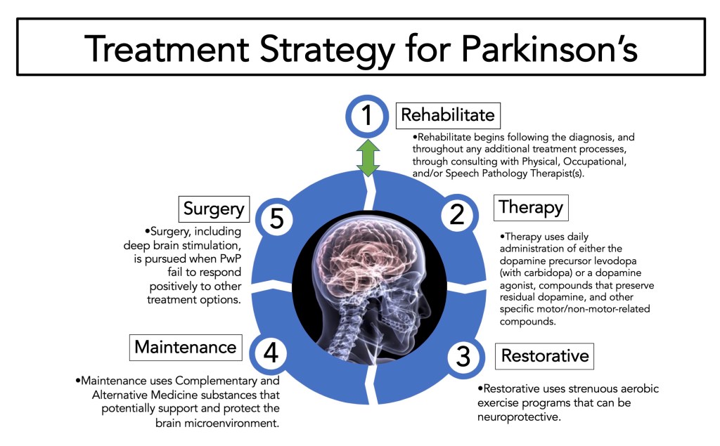 Overview of Treating Parkinson’s– The second paper mentioned above began as an integrated medicine and health therapy strategy expansion that described five treatment options for PwP, including Rehabilitate, Therapy, Restoration, Maintenance, and Surgery. This treatment scheme is described further in the figure below. The paper also summarizes each of the five treatment options for Parkinson’s.