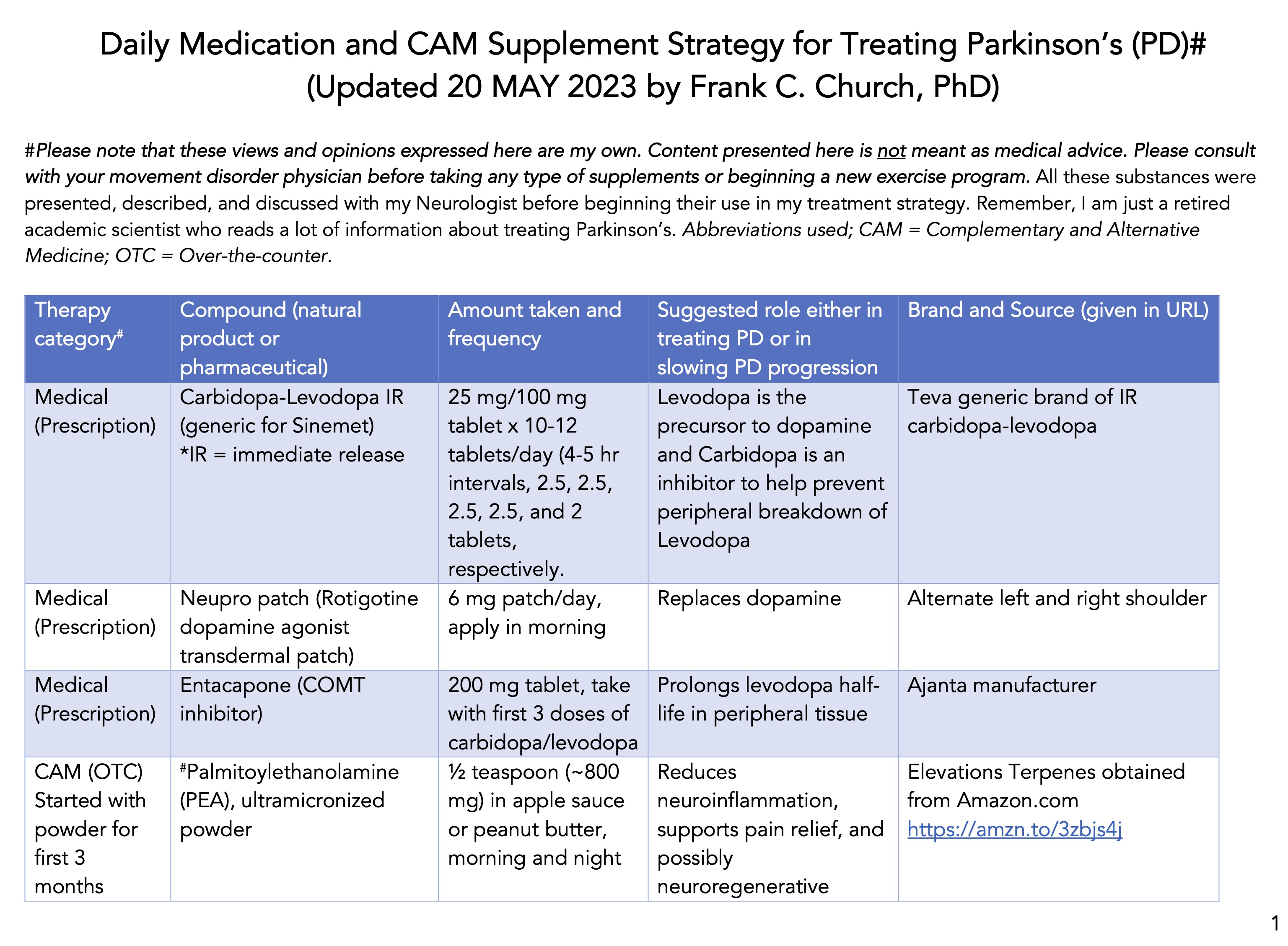 Background: The overarching theme I follow is based on what I have read on the treatment of Parkinson’s and, hopefully, on the mode of action of each substance derived from experimental results or in support of some scientific principle. The bottom line, I want to take something safe, reasonably inexpensive, and has the potential to alter or improve my symptoms.