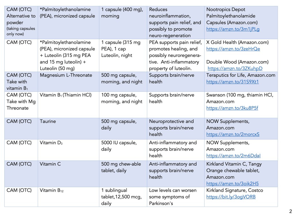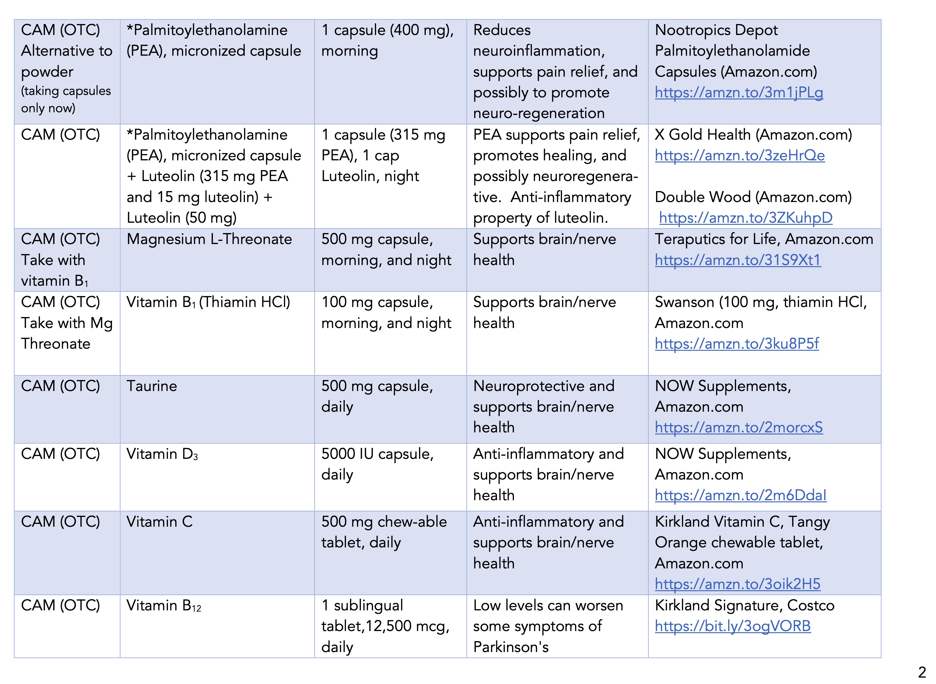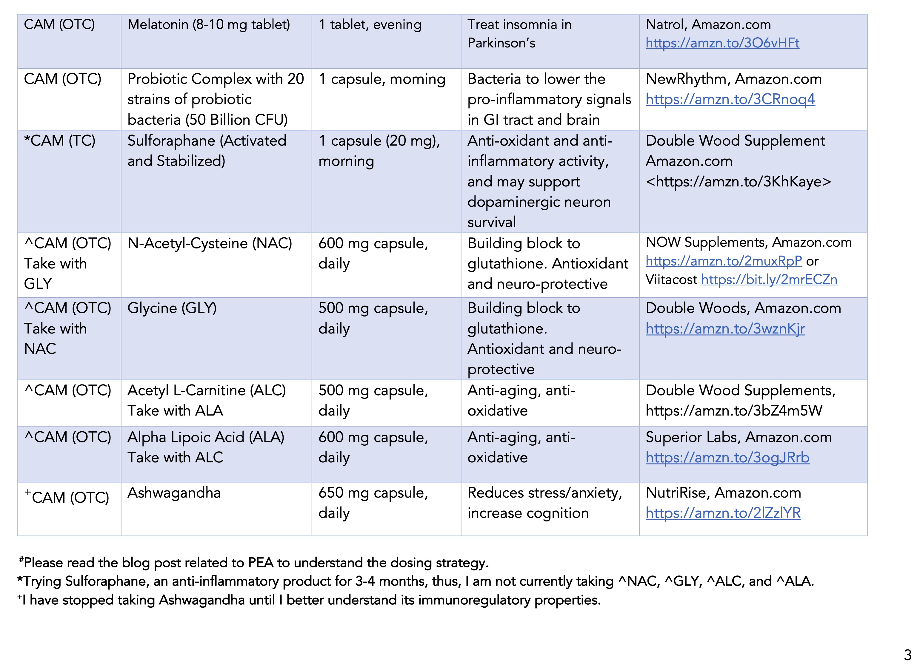 In other words, each PwP may require a different treatment plan than the next PwP. Therefore, my treatment plan may or may not work for you as it functions for me. However, there is a substantial overlap of symptoms, and the causes of the disorder are likely similar to some extent. This would indicate some generalized goodness could be realized by presenting a treatment plan with some tweaking. It at least would give the background and foundation to begin building and designing their own CAM treatment plan. Before trying any of these supplements, please consult with your Neurologist.