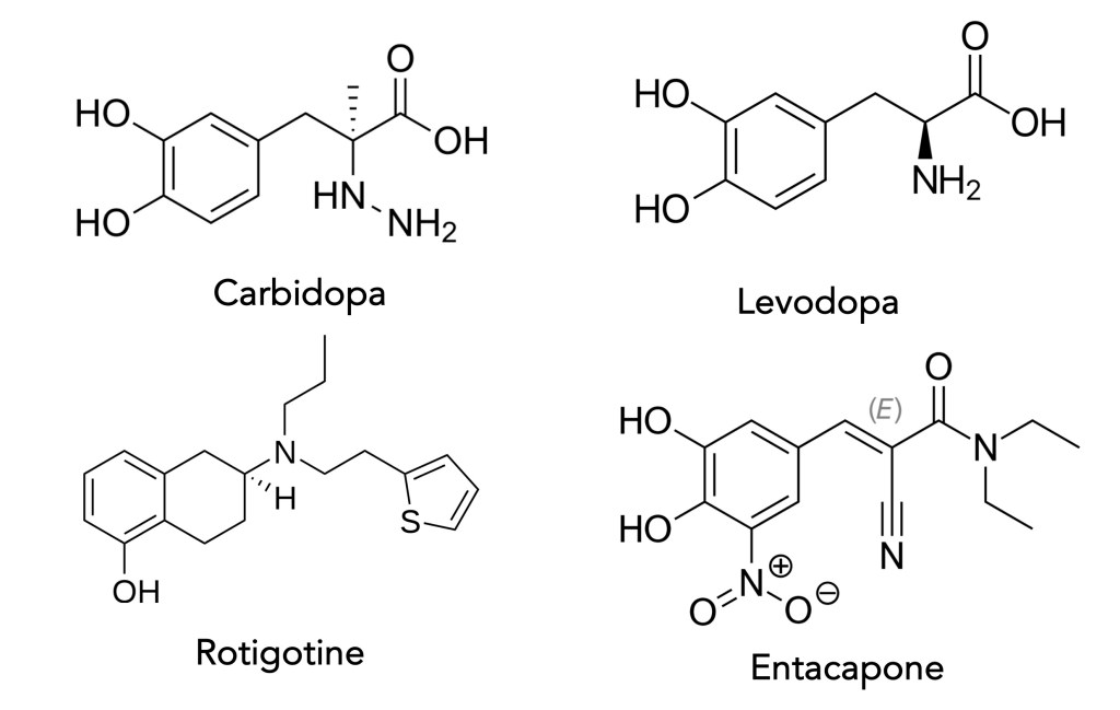 Dopamine replacement– I need a steady course of Levodopa, the immediate precursor to dopamine. Thus, I take 10-12 Carbidopa/Levodopa tablets (25 mg/100 mg) daily. In addition, I use a Rotigotine dopamine-agonist patch (6 mg, which is released over 24 h). Recently, I added a COMT inhibitor, Entacapone (200 mg tablet), which I take with my first three Carbidopa/Levodopa doses. I can only speak for myself, but Entacapone is almost ‘magical’ in stabilizing the on/off issues of Carbidopa/Levodopa. Many days, I have skipped my final dose of Carbidopa/Levodopa. The chemical structures of these dopamine-replacement compounds are given below.