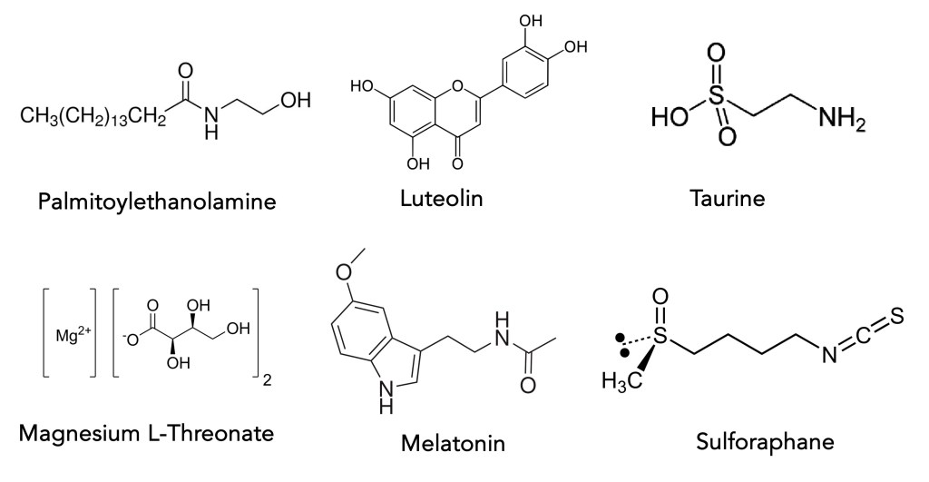 Neuroprotective Supplements– I am a fan of substances that propose they are neuroprotective. A sub-category would be compounds that reduce neuroinflammation. Thus, as mentioned above, I find PEA essential (NOTE: search out and use micronized and ultra-micronized products because it is easier for the body to assimilate). Likewise, both Luteolin and Sulforaphane have anti-inflammatory properties (stay tuned for future blog posts on both compounds). The other sub-category that I think is important is a substance that supports brain/nerve/neuron health. Magnesium L-Threonate and Taurine are reported to be good for a healthy brain in this group. The chemical structures of these compounds are given below.