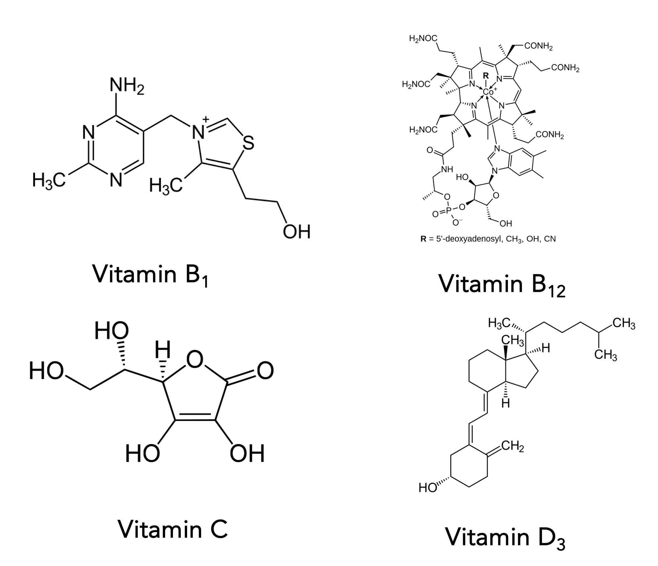 Vitamins– I am a big fan of the below vitamins, including vitamin B1, vitamin B12, vitamin C, and vitamin D3. Vitamin B1, also called Thiamin (or Thiamine), has many devout followers of HDT (High Dose Thiamin) by titrating up to 3-4 grams daily. Many have had tremendous results with motor symptom relief. My arm tremor went nuts when I tried tapering up on Thiamin. So I have settled on 100 mg tablets twice/day. Vitamin B12 has a unique role in nerve health, and Vitamin C is a potent antioxidant. Vitamin D3 has been found to boost one’s immune system and is suitable for healthy brains by its anti-inflammatory properties. The chemical structures of these vitamins are given below.