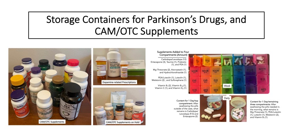 CAM/OTC Supplement Storage Containers– I keep the supplement bottles in a nylon bag, and weekly, I carefully count out and place them into a 7-day 4-compartment pill case. Then daily, I take many pills first thing in the morning (and attach one Neupro patch to my arm). Finally, I use the small circular pill cases to keep the remaining supplements close when needed. And do not forget; you might need to invest in a pill cutter (mine was less than ~$3.00). The photos below demonstrate the collection of sustained. The photos below show the collection of supplements and the containers used to hold them for a week and a day, respectively.