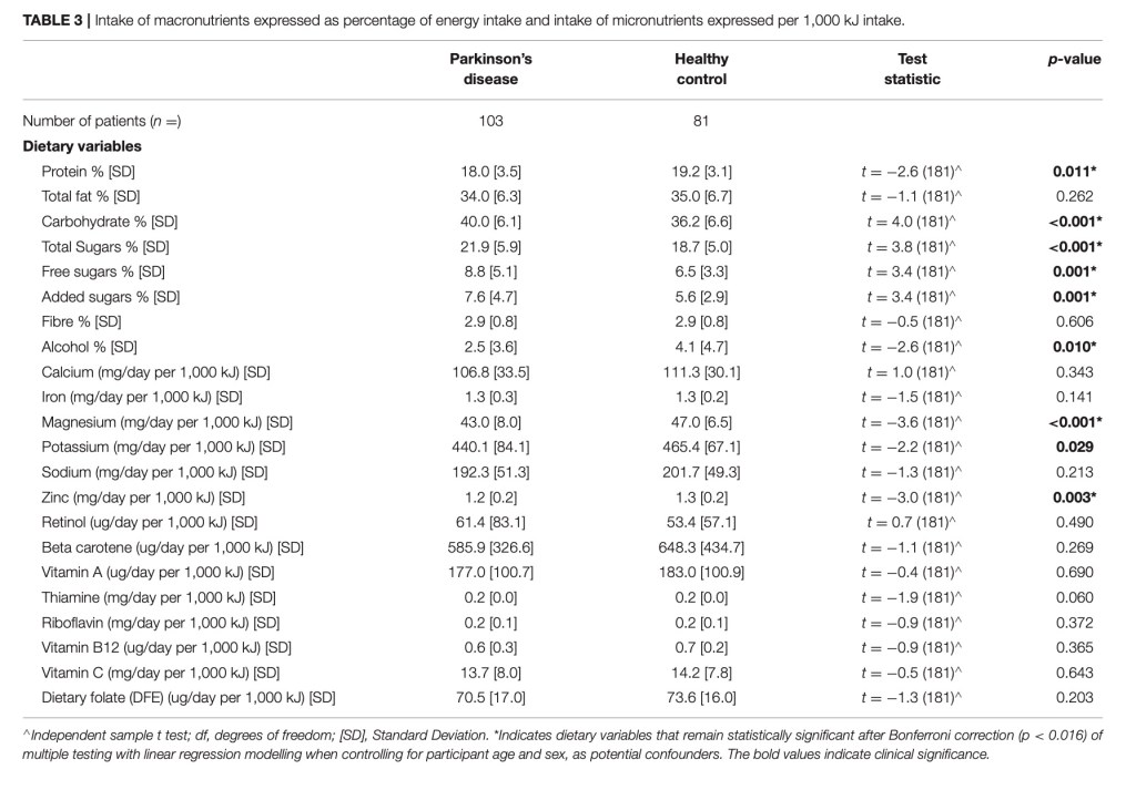 •Cognition: PwP who met the criterion for Parkinson’s dementia consumed significantly more total sugar per day than PwP without a cognition defect.