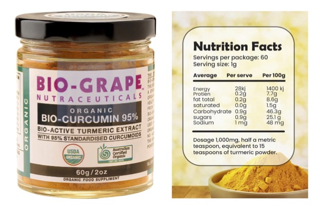 *If using a concentrated product like the Bio-Grape Bio-Curcumin (1/2 metric teaspoon contains up to 1000 mg curcumin), I suggest using either 1/8 to 1/4 teaspoon of this product).