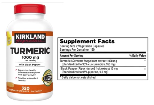 •Turmeric/Curcumin Supplements– A highly rated turmeric is the supplement from Costco (Kirkland Signature Turmeric 1000 mg, 320 Capsules, a daily dose of 2 capsules gave 950 mg curcuminoids, which gave 742 mg curcumin) and revealed no contamination with lead as reviewed by ConsumerLab.com. Currently, I am taking the PEA/turmeric complex from XGold Health, which provides 500 mg curcumin in one capsule. However, I can see switching or incorporating the Costco product into my daily regimen.