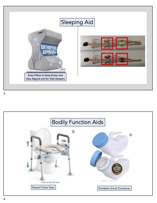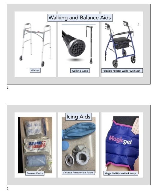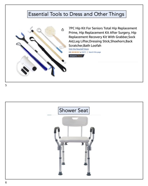 The home health group sent me a walker and elevated bedside commode (I set it up in the bathroom). Pictured below are the other pieces of equipment I purchased to aid in my recovery. Everything shown has been used on a daily basis: walking and balance aids, icing aids, sleeping aid, daily function aids, tools to help you get dressed, anti-embolism stockings, and an assortment of prescription (including two narcotic drugs) and OTC items to help manage the inflammation, swelling, and pain during recovery and rehabilitation time.
