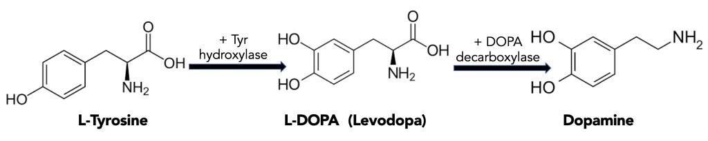 Brain Biochemistry- Making Dopamine: One of the first things you read about upon learning about Parkinson’s is the importance of dopamine. Dopamine is a drug in the brain, acting as a chemical messenger for pleasure, reward, motivation, movement, mood, and learning. It also seems that getting too much dopamine could lead to aggressive behavior. As a biochemist, I see dopamine as a molecule that evolved from the enzymatic modification of the amino acid L-Tyrosine: