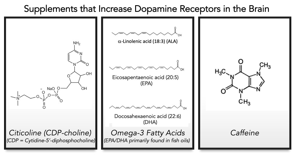 The focus of this blog post is the potential use of supplements that augment the dopaminergic machinery itself, which has the promise of modifying treatment and potentially slowing progression by maintaining or even increasing dopamine levels or altering the action or number of dopamine receptors. Ultimately, the potential of these supplements could boost the dopamine system and require less levodopa in an individual with Parkinson’s than without the use of these supplements. These compounds are shown below and will be discussed in the order of citicoline (CDP-choline), omega-3 fatty acids, and caffeine.