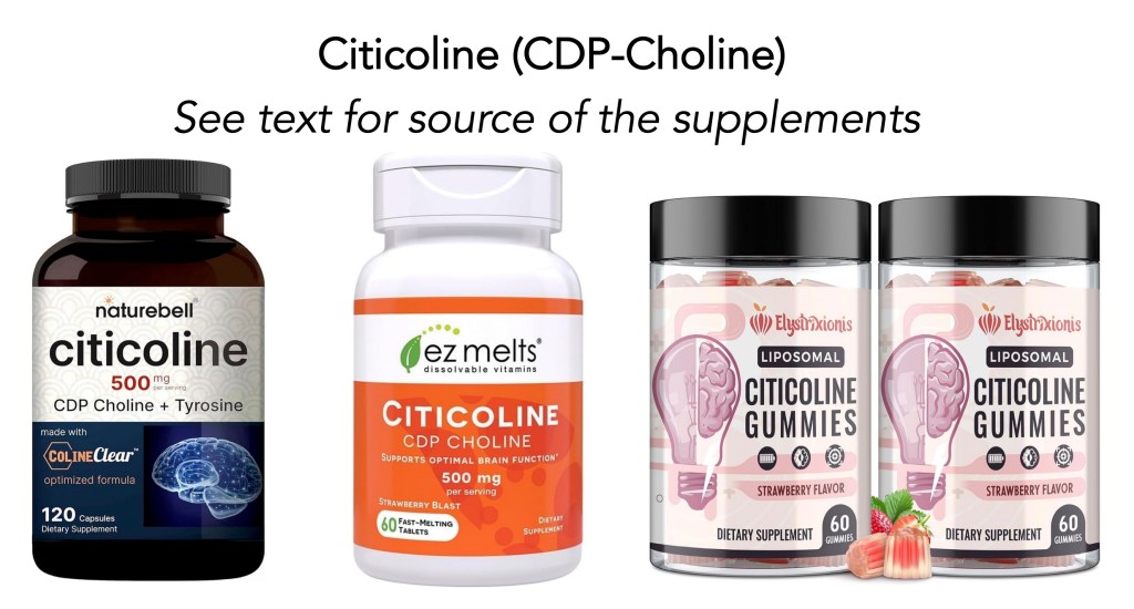 My History with CDP-Choline: I have tried it twice over the past 2 years. In 2024, I started with 500 mg/day of CDP-choline (2 capsules in the morning using NatureBell Citicoline (Amazon.com, click here). After 2 months of using it, I was taking about 200 mg less of levodopa/carbidopa (i..e, generic form of Sinemet) than the 1300 mg/day that I had been taking. One knee operation, and then switching to Crexont, and preparing for the first hip replacement surgery, led me to simplify my supplement schedule, and I stopped using it.