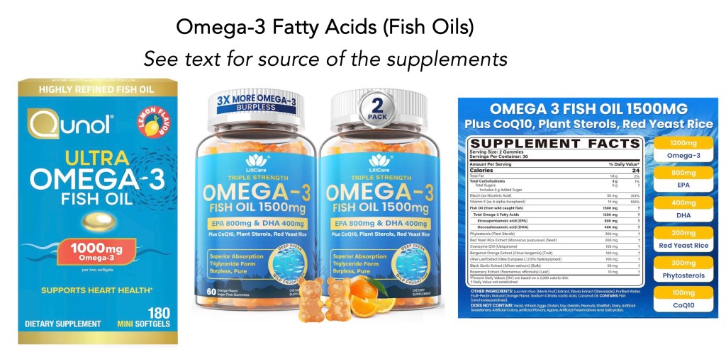 My History with Omega-3 Fatty Acids: After reading about the benefits of omega-3 fatty acids in Parkinson’s, it seemed logical to add them along with the CDP-choline supplement and see what happens. I have tried two different fish oil formulas. The first was Qunol Fish Oil Omega-3 Mini Softgels (click here), which provided 1000 mg of omega-3 EPA (645 mg) and DHA (310 mg), and 45 mg of other omega-3 fatty acids. I have always had a pill/capsule size and shape limit. Usually, anything >600 mg is hard for me to swallow. And the type of supplement matters as well; capsules are usually better than tablets. I thought these mini softgels would be okay, but they were constantly getting stuck on the way down. I have switched to LiliCare Fish Oil Omega-3 Gummies 1500 mg for Adults – Triple Strength with EPA (800 mg) and DHA (400 mg) (click here). The results described above are what I feel the CDP-choline and omega-3 fatty acids are contributing to the improved microenvironment in my dopamine-producing area. As noted before, I have only the change noted in the amount of Crexont I take on a daily basis. Regardless, the studies performed to date all suggest a beneficial role for using omega-3 fatty acids as supplements.